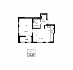 Тип планування: №11.5 Статус: В проєкті Кількість кімнат: 1 Загальна площа: 46.69 м2 Житлова площа: 14.89 м2