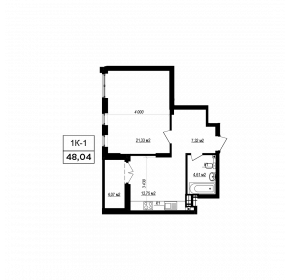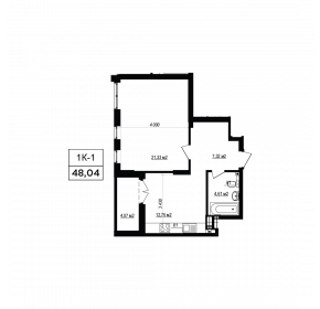 Тип планування: №9.6 Статус: В проєкті Кількість кімнат: 1 Загальна площа: 48.04 м2 Житлова площа: 21.33 м2
