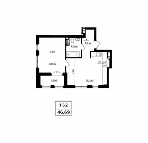 Тип планування: №9.5 Статус: В проєкті Кількість кімнат: 1 Загальна площа: 46.69 м2 Житлова площа: 14.89 м2